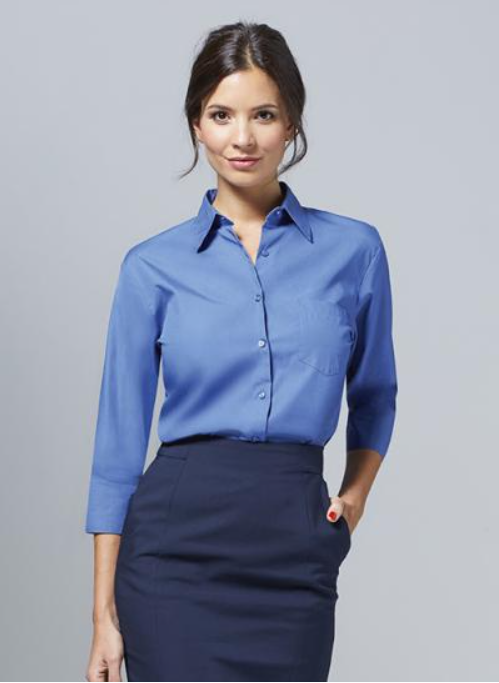 Γυναικείο μακρυμάνικο πουκάμισο από ποπλίνα, με κλασικό γιακά με κουμπί, τσέπη στο σημείο της καρδιάς, πατιλέτα με επτά κουμπιά στο ίδιο χρώμα και μανίκια 3/4 με κουμπότρυπα.